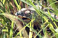 Ein Chamäleon linst aus dem Gras.