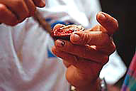 Das blutrote Harz wird auf der betroffenen Stelle verrieben bis es weiss